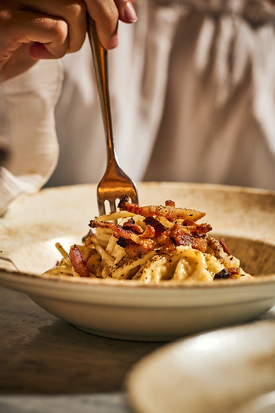 Spaghetti Carbonara: Free range egg, guanciale, Pecorino Romano & flat leaf parsley